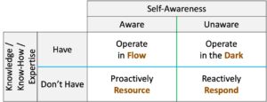 Shifting to the bottom half of the grid, when a person has awareness of something they don’t know how to do, they can proactively engage resources. I’m aware that I don’t know how to fly a plane, so I buy a ticket on a flight when I want to travel a far distance. This is a simple example, but by extension, self-awareness of a person’s gaps in know-how frees that person of the burden or stress of doing something they don’t know how to do while simultaneously offering opportunities to proactively engage people or resources who do. Without this awareness, resources can only be engaged reactively, responding to events or needs as they come.